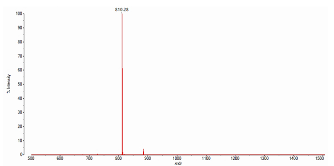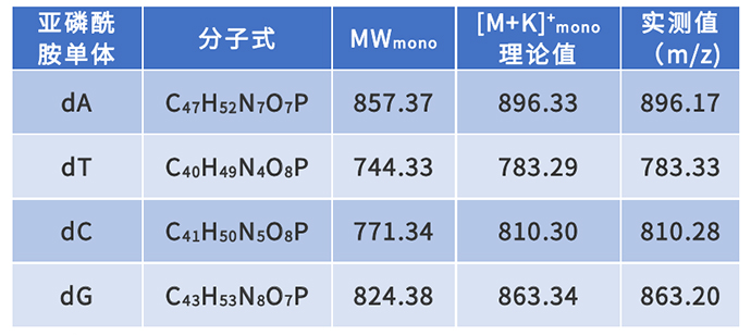 采用MALDI-8030测定了四种亚磷酰胺单体的分子量,在线性正离子模式下,均检测到显著质谱峰,质荷比大小与钾离子加合峰相符。MALDI-8030体积紧凑、分析速度快、维护方便,是寡核苷酸样品分析的有力工具。