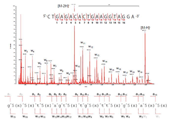 寡核苷酸的序列同设计序列一致,是保证药物有效性的重要方面。采用MALDI-8030测定了长度为20 mer的一种寡核苷酸的分子量和碱基序列。寡核苷酸的MADLI-TOF质谱图主要以单电荷和双电荷形式存在,可直接读出分子量,操作简单,结果直观。利用源内裂解技术(ISD),寡核苷酸更倾向于形成w型碎裂离子,碎裂离子谱图更简单。通过比对这些碎片离子信息,可以较容易地读出核酸序列。