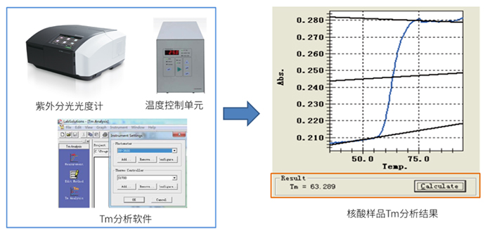 UV Tm分析系统组成(左)和核酸样品Tm分析结果(右)