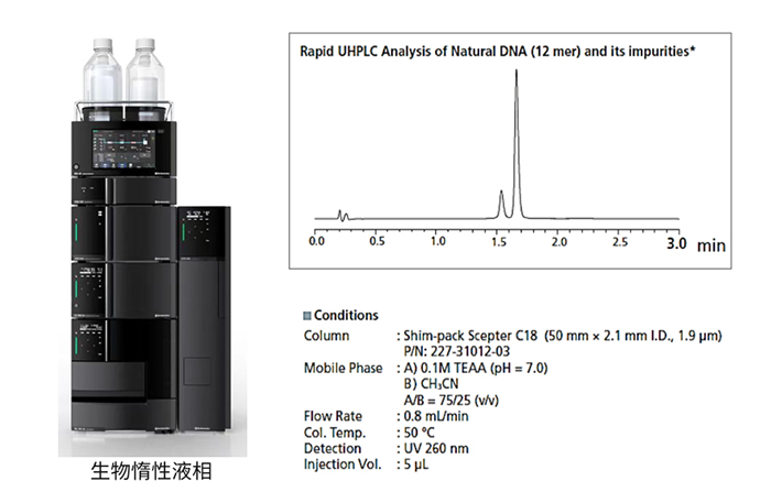 使用生物惰性液相Nexera XS Inert结合Shim-pack Scepter C18色谱柱进行了寡核苷酸样品的快速纯度分析,寡核苷酸和其杂质分离良好。即使在50℃高温、0.1M TEAA的盐浓度条件下分析,也表现出良好的稳定性。基于有机杂化颗粒硅胶技术的Shim-pack Scepter C18,适合用于寡核苷酸纯度以及杂质分析。