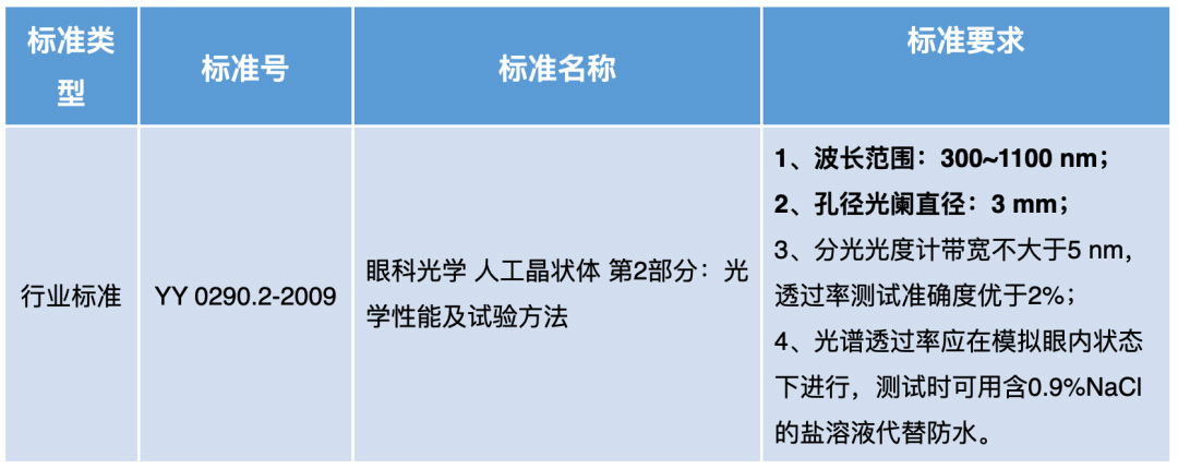中国医药行业标准YY 0290.2-2009《眼光科学 人工晶状体 第2部分:光学性能及试验方法》规定了对于人工晶状体透光性能的要求,具体要求见表1。