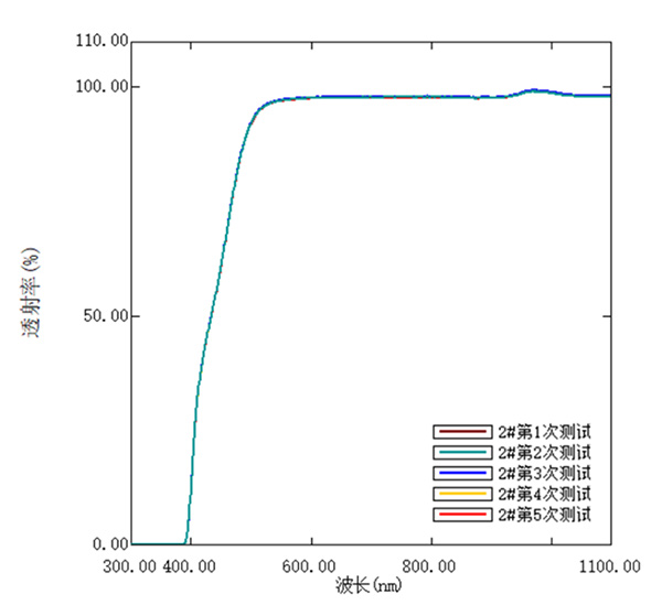 为了考察该人工晶体支架测试的重复性,对2#样品进行5次测量,每次测试需要拆开支架重新装样,以验证人工晶体支架对于样品定位的准确性,重复性测试光谱见图6。从结果上看,5次测试的光透过率数据重复性较好,说明设计的人工晶体支架能够将人工晶体样品准确固定在定位孔中。