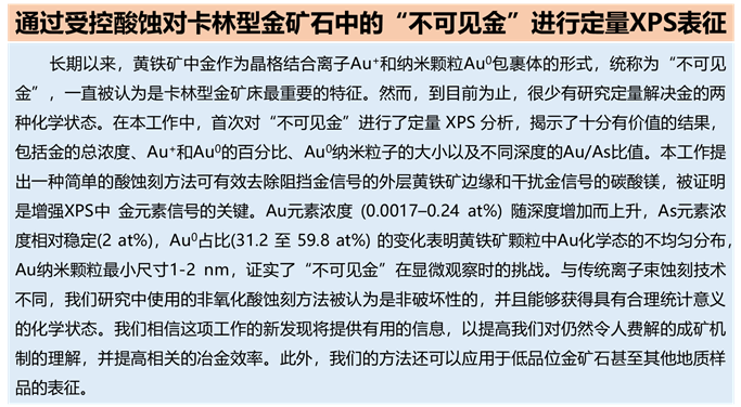 卡林型金矿(Carlin-type gold deposit),于20世纪60年代初期在美国西部内华达州的卡林镇被发现,从而得名,其显著特征是金在载金矿物(主要为含砷黄铁矿)中常以晶格金(Au+)和纳米级包体金(Au0)的形式赋存,因金无法直接通过光学显微镜观察而被称为“不可见金”。“不可见金”赋存状态的研究对卡林型金矿的选冶及其微观成因机制有重要的指示意义,然而“不可见金”的定量表征仍然存在较大难点。中国科学院地球化学研究所万泉研究员及其团队采用逐级酸蚀与XPS分析相结合的手段建立了卡林型金矿中金赋存状态的定量表征方法,首次通过XPS分析成功获得了“不可见金”的量化分布规律,相关研究成果以封面文章形式发表于《Journal of Analytical Atomic Spectrometry》期刊。
