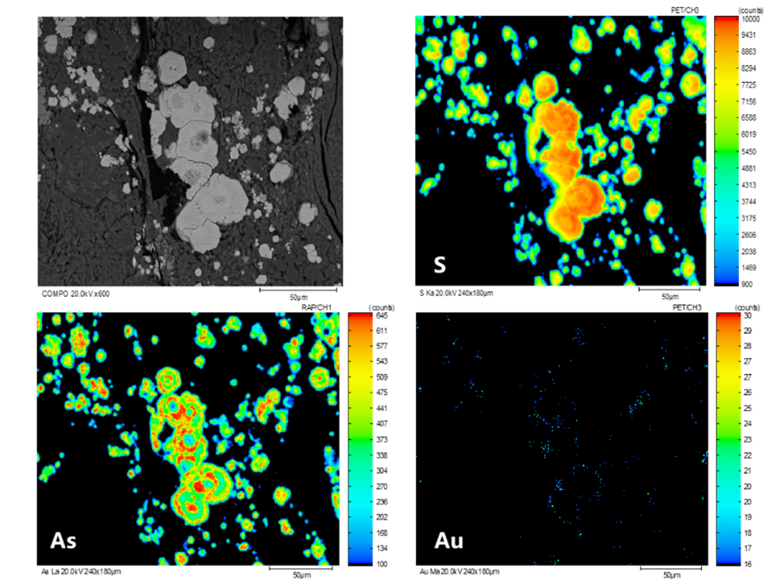 黄铁矿表面通常覆有厚达几百纳米的贫金层(该层主要为FeS2),通过EPMA(电子探针)测试可得到S、As、Au元素分布,如图4,可见Au含量较低且主要存在于黄铁矿中贫金层下的富As区域。