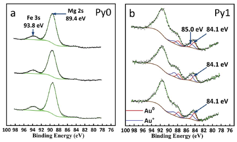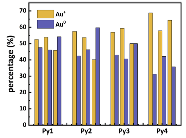 图6. 利用 Py1-Py4的Au 4f XPS光谱分峰拟合估算的Au+和Au0的百分占比