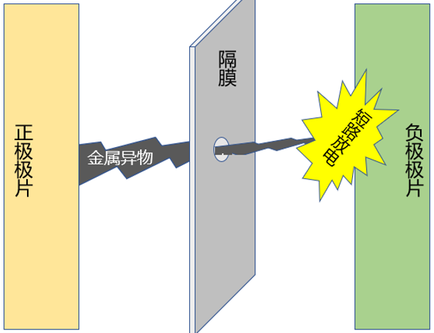 锂电池极片制作流程繁杂,在电极浆料制备过程、极片辊涂、切割、卷绕工序中均有可能混入金属异物或产生切割毛刺或金属碎屑等等。极片中混入尺寸较大的金属异物颗粒,可能会直接刺穿隔膜,导致正负极之间短路。或者当金属异物混入正极后,充电之后正极电位升高,高电位下金属异物发生溶解,通过电解液扩散,然后负极低电位下溶解的金属再在负极表面析出并堆积,最终刺穿隔膜,形成短路。