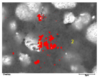 为了更为直观的显示Fe元素富集位置,将Fe元素面分布图与背散射电子像进行叠加显示,如图3所示。图3中红色标记区域即为Fe元素富集位置。