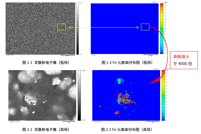 电池极片中常见混入的金属异物有Fe、Cu、Zn、Al、Sn、不锈钢等,以含Fe异物为例,为排查某正极极片中是否混入含Fe金属异物,首先在视场1.0×0.8mm下进行Fe元素的低倍大区域面扫描(开云手机登录入口·(中国)官方网站电子探针最大扫描范围可高达90×90mm),结果见图1。图1-2中黄色方框标示处,明显可见有Fe元素的富集;为进一步清晰显示异常富集情形,对图1黄色方框逐级放大至4000倍。如图2所示。