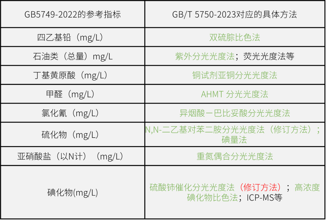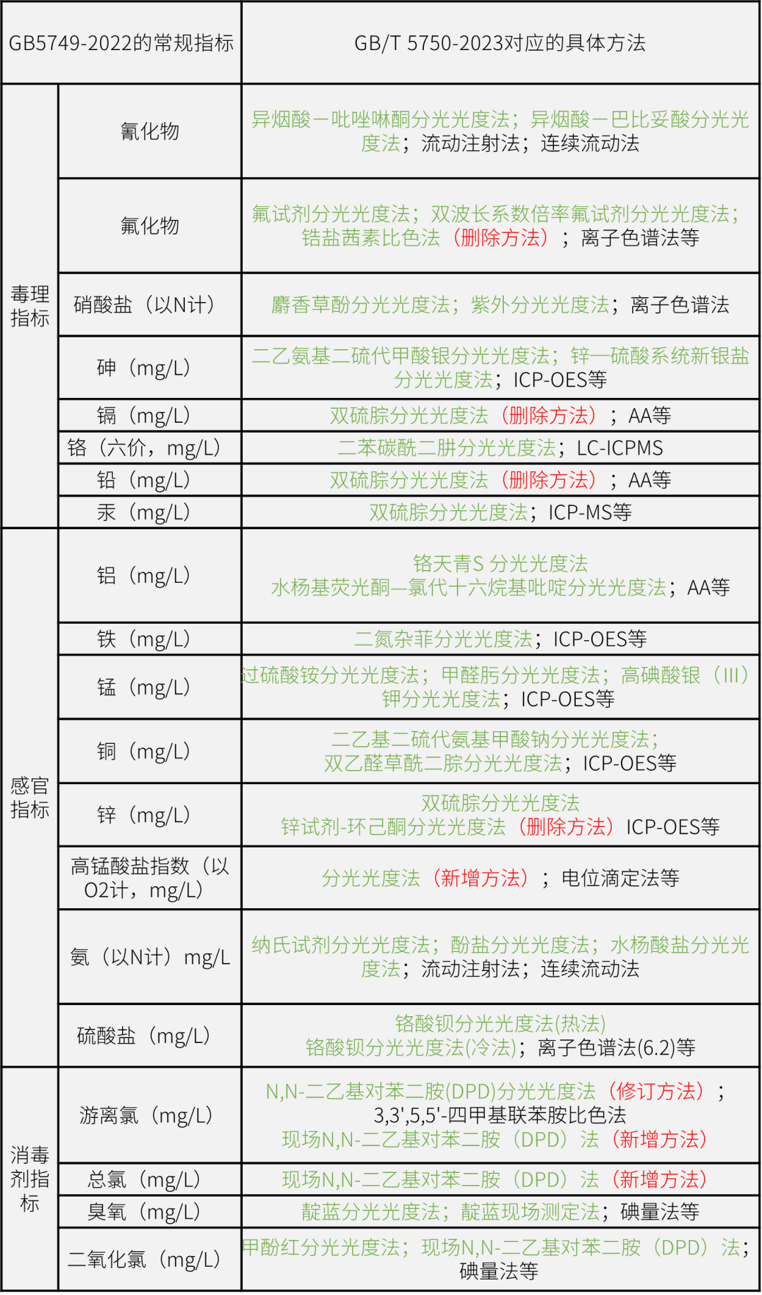 从新增方法来看,常规指标高锰酸钾指数新增了分光光度法,游离氯和总氯新增了现场N,N-二乙基对苯二胺(DPD)法。参考指标中无新增方法。这说明了新版GB/T 5750-2023的更新主要体现在方法的便利性、时效性,如高锰酸钾指数新增的分光光度法,相比之前的滴定法,操作更加方便。