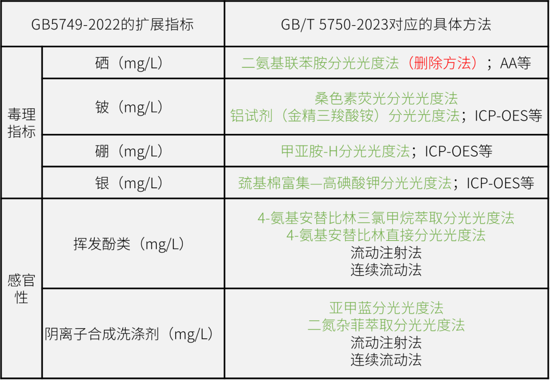 GB 5749-2022 中将水质指标分为了三大类,常规指标、扩展指标、参考指标。按照这三类指标,将对应GB/T 5750-2023中的紫外可见分光光度检测法总结为如下三个表格,请各位参考。