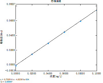六价铬的常规测定方案为UV-2600i搭配10 mm方形比色皿,先制作标准曲线,再确定未知样品含量。取50mL 自来水样,另取0、1、2、3、4、5mL标准溶液于50mL比色瓶中定容至刻度,向水样及各标准溶液中各加2.5mL硫酸溶液及2.5mL二苯碳酰二肼溶液,立即混匀,放置10min,于540 nm波长,用10mm比色皿,以纯水为参比,测定吸光度。