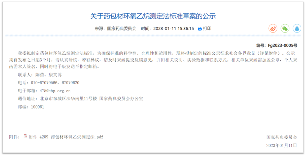 2023年1月,国家药典委员会发布了4209《药包材环氧乙烷测定法》公示稿,用于检测经过环氧乙烷灭菌的预灌封注射器组合件、滴眼剂瓶等药品包装材料中环氧乙烷残留量。