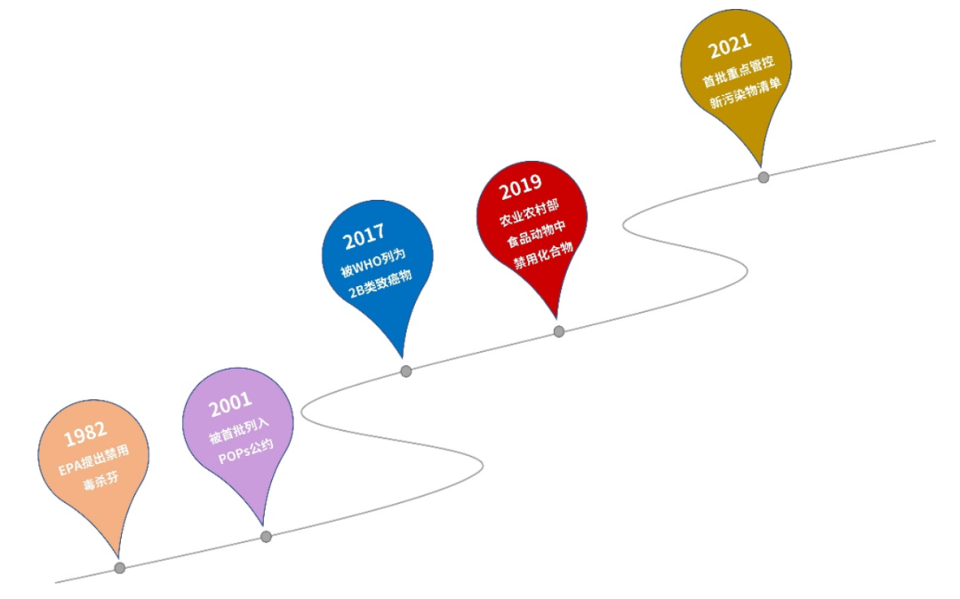 毒杀芬具有致畸、致癌、致突变等毒性,并且稳定性高、易于被生物体富集,对人类健康和环境危害极大。虽然毒杀芬20世纪90年代后在全球已被禁用,但它稳定性高、半衰期长,目前仍滞留于环境中。