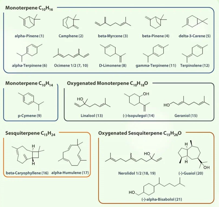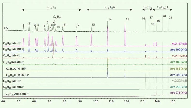 萜烯是广泛存在于植物体内的天然来源的碳氢化合物,已知化合物数量超过3万种,很多萜烯具有重要的生理活性,如保护植物细胞膜产生多种内源激素、保护植物免受强光的伤害萜烯中的信号物质和化感物质在植物防御系统中起到关键作用等,同时烯与人类健康的关系也非常密切,是人类日常膳食不可或缺的营养素。由于萜烯的化学机构非常相似 (许多是位置异构体),单EI谱图信息不足以进行准确识别,如单萜的碎片峰也可以由氧化单萜或倍半萜形成因此利用CI源进行辅助定性是非常有效的方法本应用探讨了特色SMCI源在21种萜类化合物快速筛查和萜类分布分析中的应用。