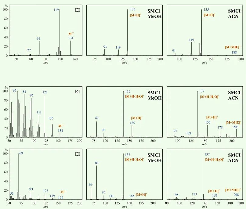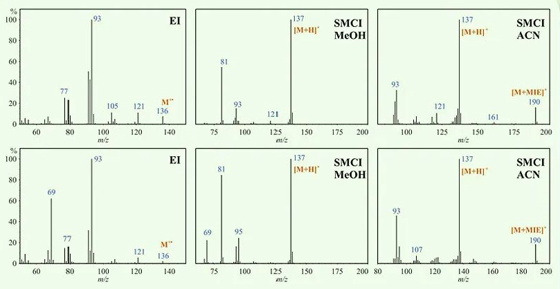 下图为几种代表性萜烯的El、SMCIMeoHSMCIACN三种方法的质谱图 (其他烯质谱图规律类似) 。在EI质谱图上,观察到萜类分子离子峰(M+)通常以极低的强度存在或缺失,给谱库匹配及定性增加了难度,如红没药醇 (Bisabolol) 的EI质谱图缺少分子离子峰,如果没有保留指数信息,则很容易被误认为是倍半帖。具体如下: