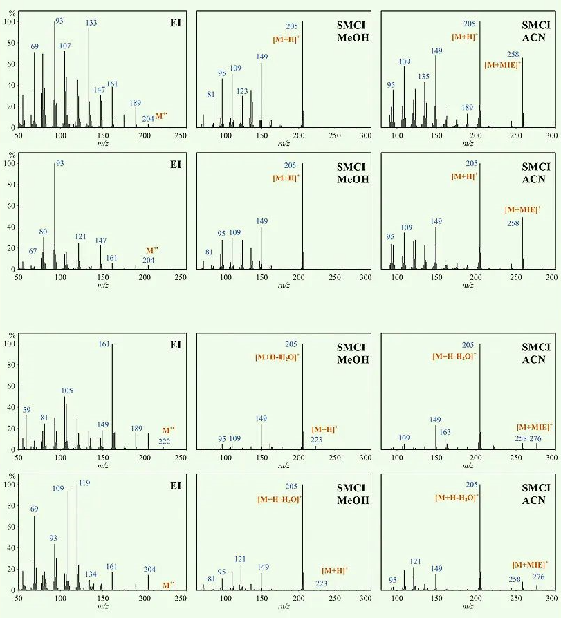 另一方面,倍半萜C15H24的SMCImeoH和SMCIACN质谱图的基峰离子都是m/z205[M+H]+离子,SMCIAcN质谱图m/z258[M+MIE]+离子也有非常高的响应。含氧倍半萜C15H26O的SMClMeoH和SMClAcn质谱图的均以m/z205[M+H-H2O]+离子为基峰离子,且SMCIACN质谱图同样观察到m/z 276[M+MIE]+离子。