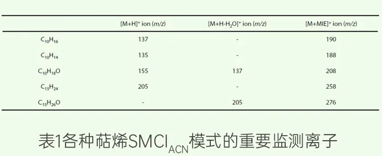 下表列出了萜烯SMClacN质谱中[M+H]+、[M+H-H2O]+、[M+MIE]+等重要监测离子。即使[M+H]+和[M+H-H2O]+有重叠,萜类的[M+MIE]+离子也具有高度的唯一性。因此这些离子可用于快速筛查未知样品中的萜烯分布。