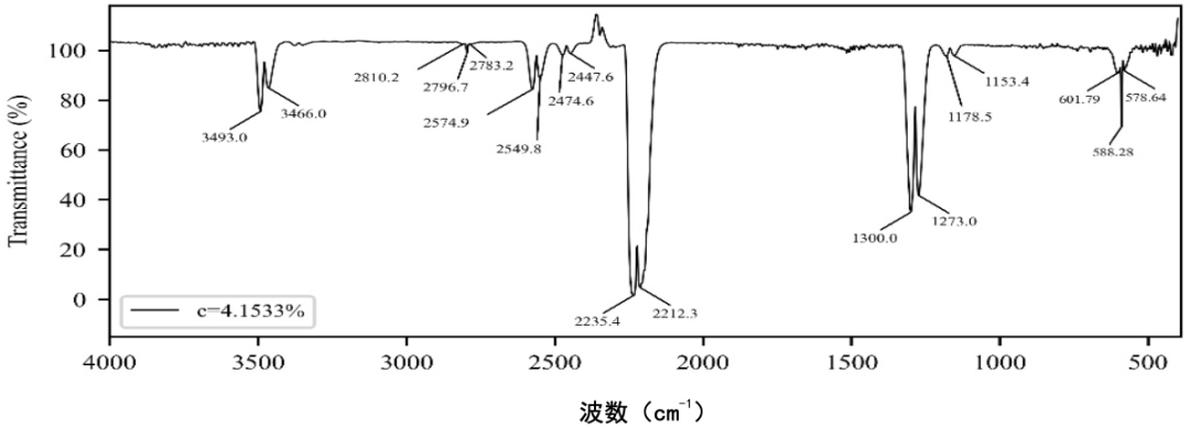 在笑气的典型红外吸收光谱图中,最强的红外吸收峰为2235.4 cm-1和2212.3 cm-1的宽强双峰,其次是1300.0 cm-1和1273.0 cm-1的宽强双峰,第三强峰是601.79 cm-1、588.28 cm-1和578.64 cm-1的三尖峰,第四强峰是3493.0 cm-1和3466.0 cm-1的双尖峰,第五强峰是2574.9 cm-1和2549.8cm-1的双尖峰。这五组吸收峰是笑气的典型红外特征吸收峰。