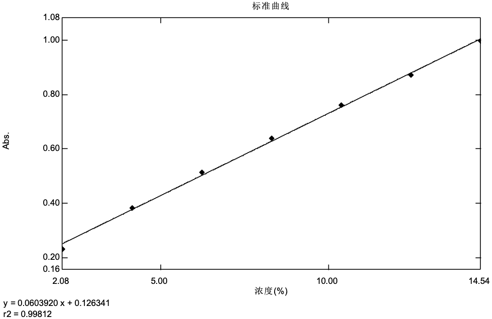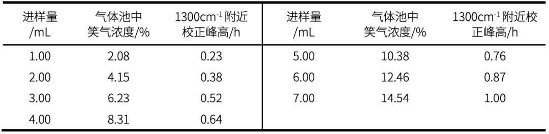 红外法适用于对不同纯度的笑气进行定性和定量分析。本文采用1300cm-1附近吸收峰作为定量分析峰,气体池中笑气浓度范围在2.08% ~ 14.54%时,笑气浓度与红外光谱吸收强度之间的关系符合朗伯-比尔定律。