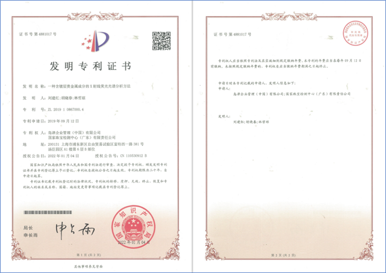开云手机登录入口·(中国)官方网站分析中心申请的中国发明专利《一种含镀层贵金属成分的X射线荧光光谱分析方法》(ZL 2019 1 0867000.4已获国家知识产权局授权),专利技术为含镀层贵金属样品成分的无损检测提供了解决方案。