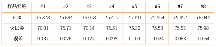使用校准的黄金分析条件,检测工厂实物黄金饰品,在EDX完成检测后,送样依据GB/T 9288-2006《金合金首饰 金含量的测定 灰吹法(火试金法)》做火试金测试, 下表列举了EDX和火试金方法的分析结果。