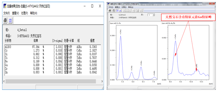 将宝石样品放置在样品杯中,样品杯使用迈拉膜,EDX-7200仪器附带的CCD选择测试部位,使用宝石测试条件分析,分析结果及谱图如下。