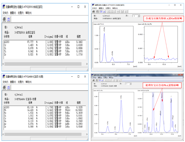 分析结果中Al以刚玉宝石的主要成分Al2O3表示。天然宝石中可见Al、Si、Cr、Fe、Ti、Ga等元素存在。Al为刚玉宝石的主要组成元素,Cr、Fe、Ti等为微量致色元素,Ga为天然刚玉宝石的指纹特征元素,合成红宝石中缺少Ga元素存在。天然红宝石常见含有Fe、Cr、Ga元素,天然蓝宝石则多含有Fe、Ti、Ga等杂质微量元素。铅玻璃充填的红宝石明显可见Pb的特征峰存在,Pb元素的存在为处理红宝石铅玻璃充填的特征结果。