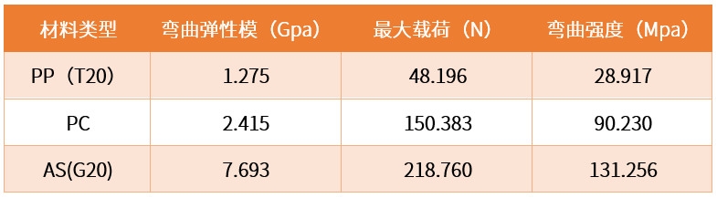 从拉伸/弯曲试验结果可以看出:在拉伸/弯曲强度,弯曲弹性模量等力学性能指标中,AS(G20)>PC>PP(T20)。