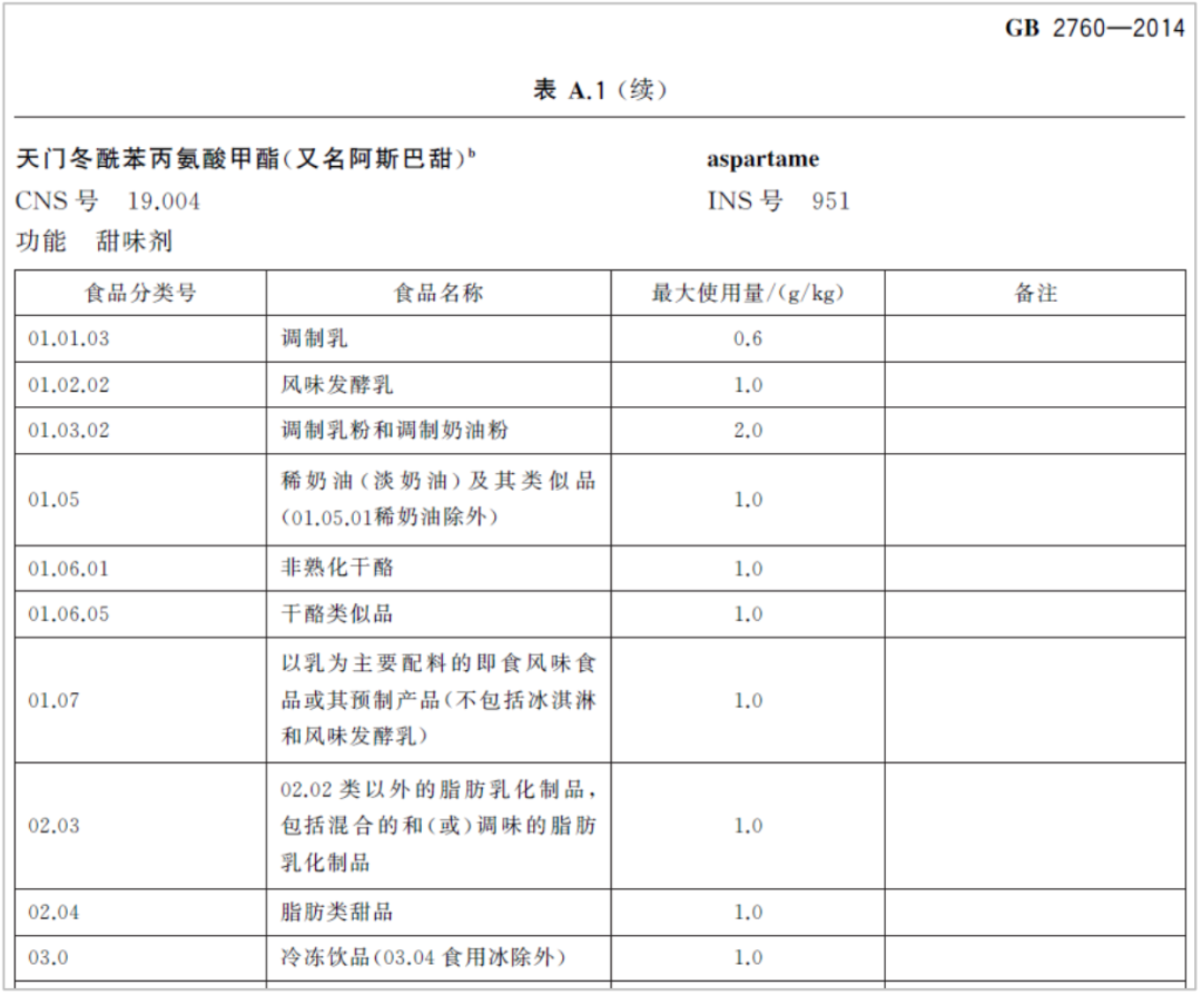 注:GB 2760-2014标准中部分食品可以添加阿斯巴甜的最大使用量。