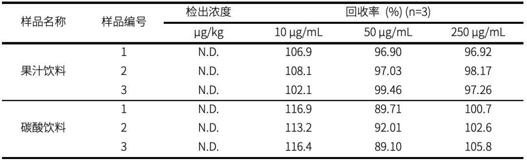 使用果汁饮料样品和碳酸饮料样品测试,考察了分析方法的准确度。
