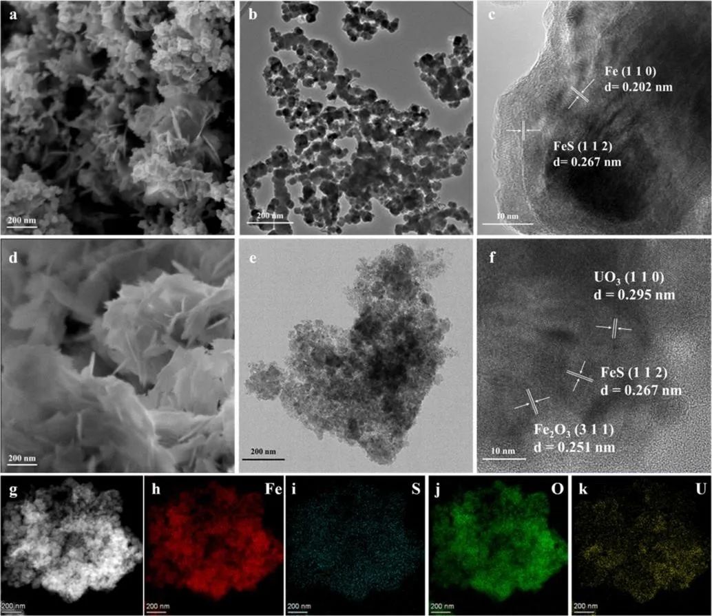 图2. S-NRI提铀前后的SEM、TEM、HRTEM和EDS-mapping