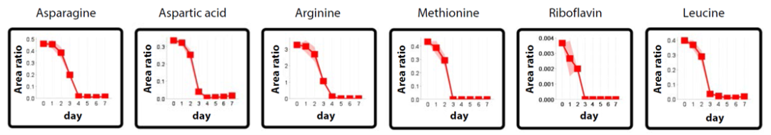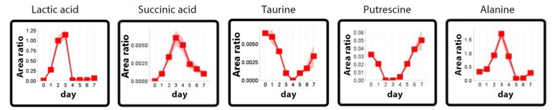 其中,表现出明显变化的组分如图4和图5所示。图4中显示,有机组分在细胞培养的后期耗尽,提供了有助于研究培养条件的信息。图5中显示,随着时间的推移,有机组分在消耗和分泌之间切换。这是一个有价值的发现,表明新陈代谢发生了变化。