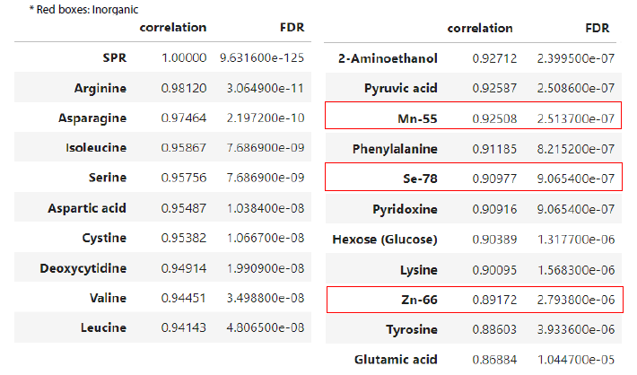 通过相关分析确定了符合这些标准的有机和无机组分。上表显示了与特异性抗体产生率呈正相关的一些组分(相关系数>0.5和FDR<0.05)。
