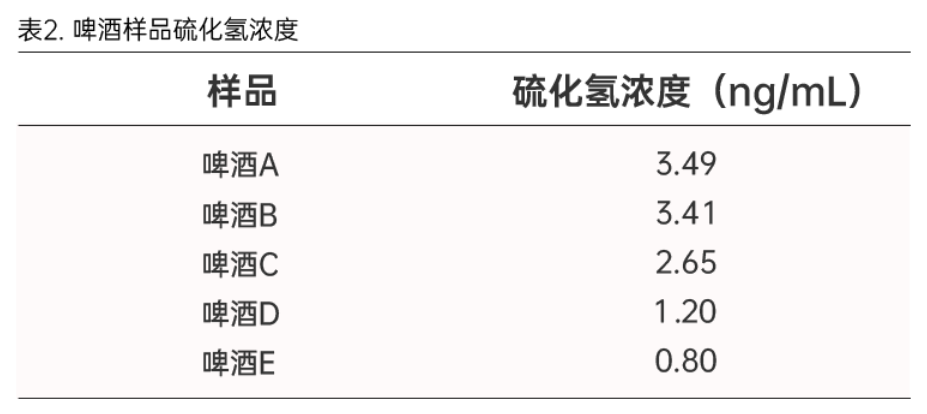 对啤酒样品进行定量分析,如下表所示,硫化氢浓度0.87~3.49ng/mL。其中啤酒样品A、B和C是Lager拉格,D和E是Ale艾尔,由于酿造工艺的不同影响硫化氢的生成,对啤酒的风味产生较大影响。