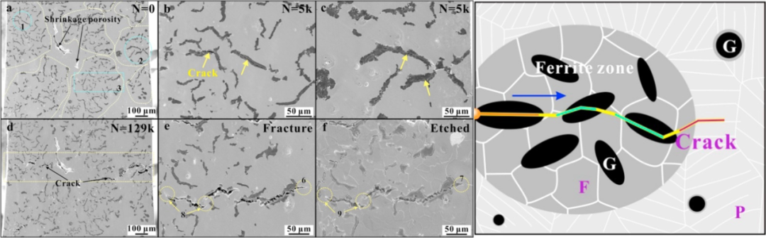 通过原位疲劳试验,研究人员分析压实石墨铸铁疲劳断裂机理为:表面石墨脱粘引起裂纹,裂纹沿蠕虫状石墨簇扩展,裂纹尖端由于存在应力集中导致周围铁素体出现塑性变形。裂纹通过切割脱粘石墨颗粒间的铁素体扩展和相互连接。裂纹切过整个铁素体区后形成主裂纹,当主裂纹切穿珠光体时,出现最终断裂。