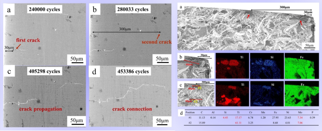 图 4. 高温合金涡轮盘低周疲劳裂纹扩展过程及疲劳源区的相分析