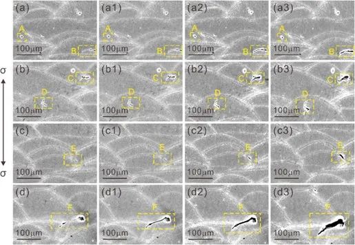 研究人员利用原位扫描电镜,实时观察了3D打印4种形态的缺陷在拉应力作用下的变形情况,得出缺陷演变与缺陷的几何形状和轴向方向有关:圆形缺陷的变形能力有限,而与轴向加载方向垂直的裂纹缺陷在拉应力作用下会变宽,半圆形熔池界面附近的裂纹状缺陷倾向于沿该界面扩展。