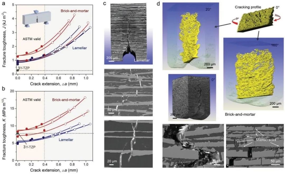 研究人员研发的新型义齿材料微观上具有与天然贝壳类似的组织结构,氧化锆以片层形式平行排列或以“砖墙”形式紧密堆叠,其间的空隙以树脂填充。课题组自行设计夹具,改变加载方式,通过原位扫描电子显微观察记录裂纹扩展长度,基于非线性弹性断裂力学通过公式计算材料的J积分,并转换为与J积分相对应的有效应力强度因子评价材料的的断裂韧性,研究人员得到高韧性和高损伤容限的复合材料。