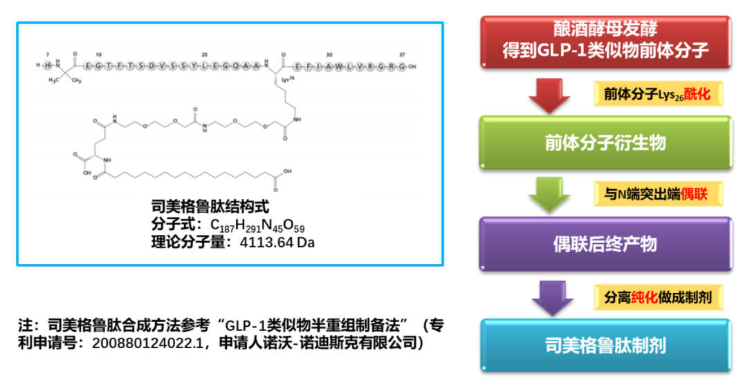 司美格鲁肽(Semaglutide,又叫索马鲁肽)由31个氨基酸组成,通常按照半重组法进行合成,先经酿酒酵母重组表达获得GLP-1类似物前体分子,再对GLP-1骨架第26位的赖氨酸连进行修饰,然后将其与包含非蛋白氨基酸的N端氨基酸突出端进行偶联,获得最终产物。