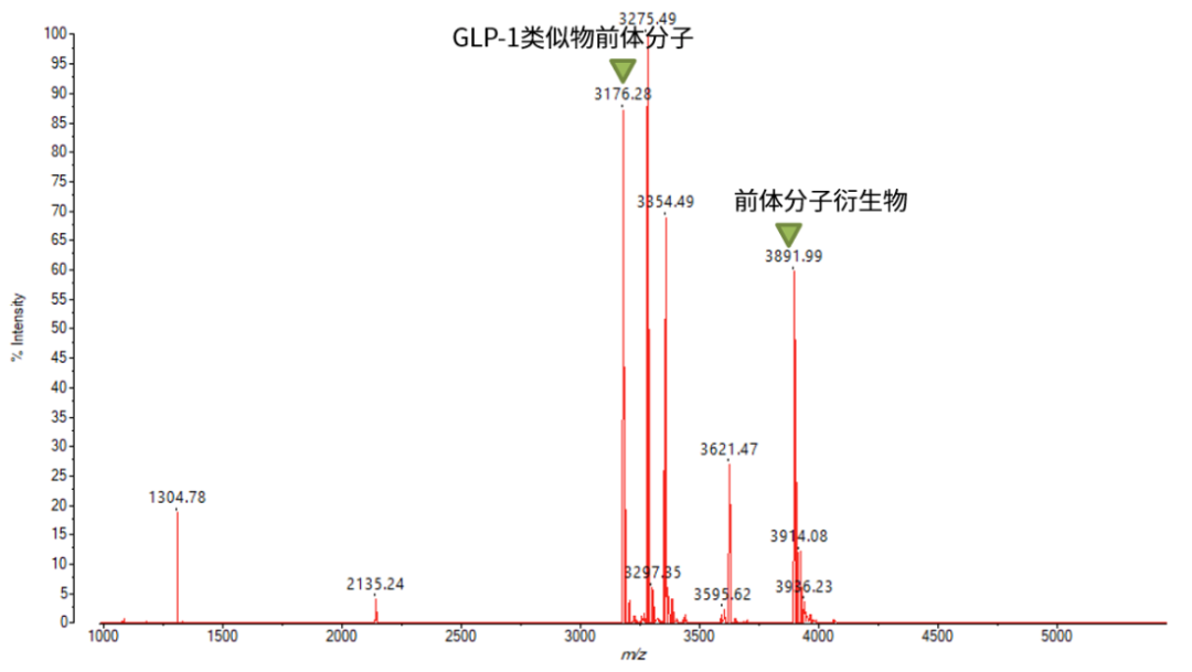 应用台式基质辅助激光解吸电离飞行时间质谱MALDI-8030对司美格鲁肽在研合成中间体、制剂产品进行分子量及杂质检测,无需液相分离以及复杂的解卷积等数据分析操作,分析速度快,结果简单、直观,通过质谱图中信号离子的质荷比的大小与分布,可快速确认多肽的精确分子量、合成效果及杂质组成情况,为多肽药物合成的质量控制、生产工艺的优化与调整提供参考与依据。