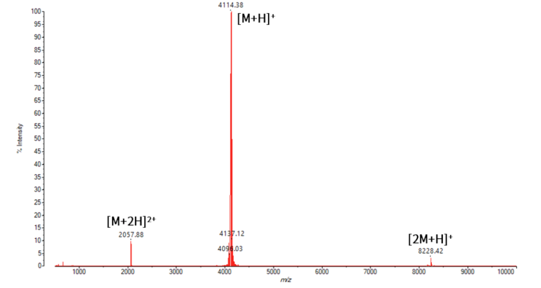 司美格鲁肽制剂应用MLADI-8030检测到m/z 4114.38、m/z 2057.88、m/z 8228.42的离子峰,分别对应化合物的[M+H]+、[M+2H]2+与[2M+H]+形式,药物纯度较好。