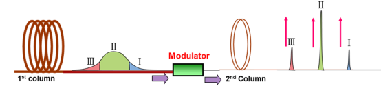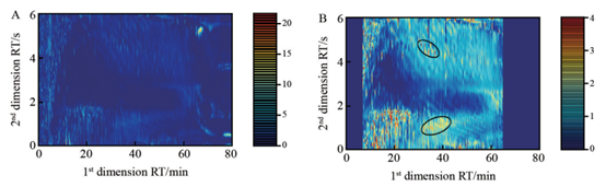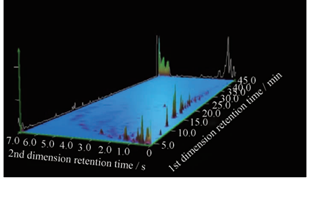 全二维气相色谱(GC×GC)是把分离机理不同而又相互独立的两根色谱柱通过调制器以串联方式连接成二维气相色谱柱系统,通过设置一定的调制时间(调制周期)将一维流出物捕集,聚焦后释放到二维色谱柱进一步的分离,通过专用软件将色谱峰转化成为全二维谱图。全二维气相色谱比普通一维气相色谱具有分辨率更高、峰容量大、灵敏度好等优点,为复杂样品提供全新而有效的分离方式。