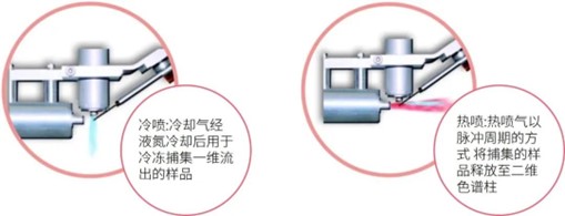 调制解调器是GC×GC技术的关键,特色环形设计的调制解调器通过液氮制冷连续切割技术可以高效率捕集宽沸程(C3~C55)组分,并在二维实现超快速分离,形成极尖锐的峰,更有利于复杂组分的分离。环形设计的调制器仅使用一个冷喷嘴和一个热喷嘴,相对于以往两个冷喷嘴和两个热喷嘴,冷却气消耗量大幅降低,柱温箱内温度也更加稳定。