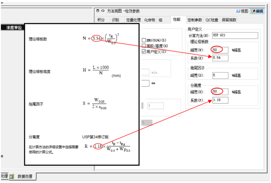 USP[1]中对于分离度RS、理论塔板数N的计算公式及其中的参数都有明确要求:其中半高峰宽(W0.5)是指50%峰高处的峰宽。小伙伴们需要按照药典要求输入相应的系数和条件,具体操作流程: