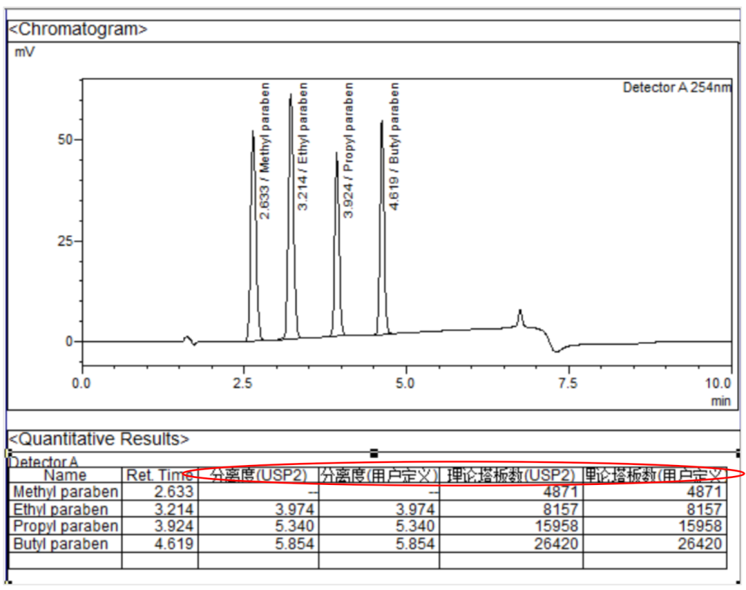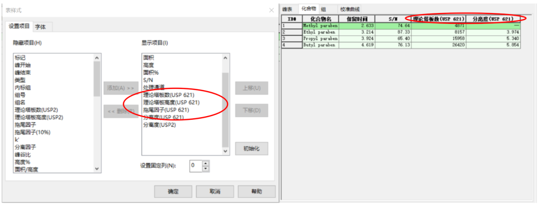 在结果视图中点击峰表-->右键表达式-->添加手动命名的的分离度Rs、理论塔板数N参数