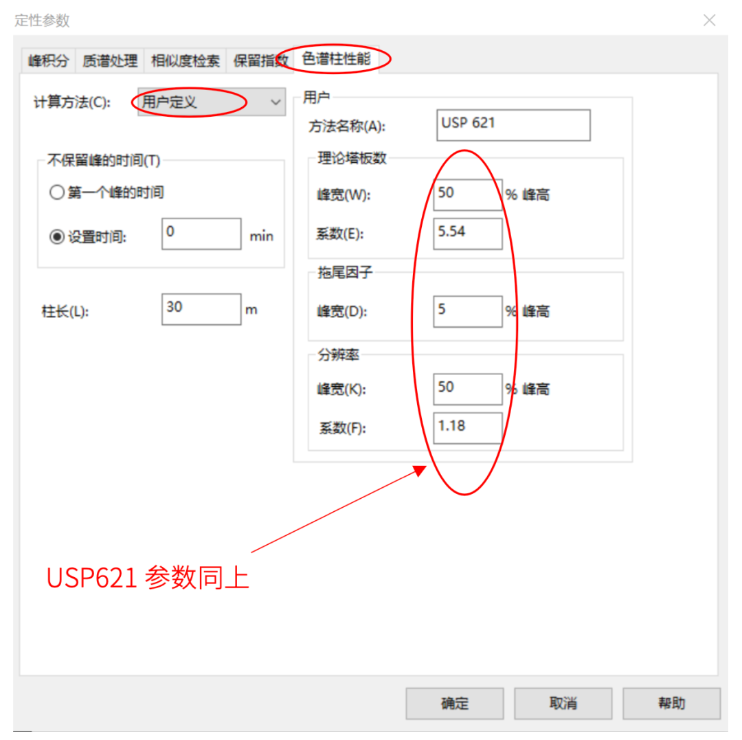 在使用GCMSsolution时如需要按照药典要求得出相应的参数,软件中自带的USP计算公式与新版的USP不一致,可以直接选用JP(参数与新版USP一致)进行计算,也可以选择用户自定义,参照上文在用户定义选卡中输入新版USP要求的数值进行计算,具体操作流程: