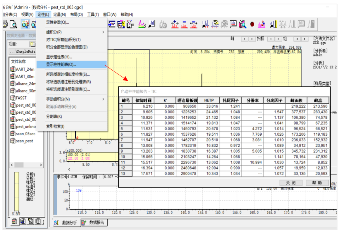 设置好相关参数后,点击定性栏下的显示柱性能表中显示相关计算结果: