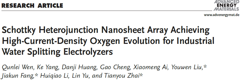 《Schottky Heterojunction Nanosheet Array Achieving High-Current-Density Oxygen Evolution for Industrial Water Splitting Electrolyzers》