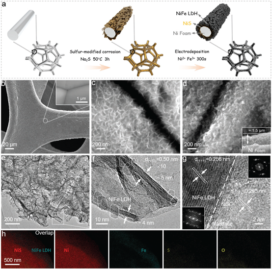 SEM研究表明,相比于其表面较为光滑的商用泡沫镍(图1b),图1c所示均匀的纳米片阵列垂直分布于镍泡沫的开放多孔骨架结构上。此外,NiFe LDH/NiS仍然保持片状形貌,在NiS纳米片表面耦合了粗糙的NiFe LDH层(图1d)。TEM研究中,横断面FESEM图像和元素映射(图1h和图1d的插图)显示,Ni泡沫表面形成了≈1.5 μm厚的NiS层,其上形成了≈0.5 μm厚的NiFe LDH层。图1e中的透射电子显微镜(TEM)图像进一步显示了NiS层与高度分散的NiFe LDH纳米颗粒耦合形成的高度波纹片状结构。在图1f中垂直分布的薄片表明这些纳米薄片的平均厚度约为5 nm。图1g-h的HRTEM图进一步揭示了NiS和NiFe LDH之间存在强耦合异质结构和可见的异质界面,以及其对应的元素分布揭示了同样的结果。