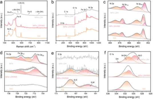 图2 成分特征。a)拉曼光谱,b) XPS总谱,c) c) Ni 2p, d) Fe 2p, e) S 2p, f) O 1s的高分辨率XPS光谱